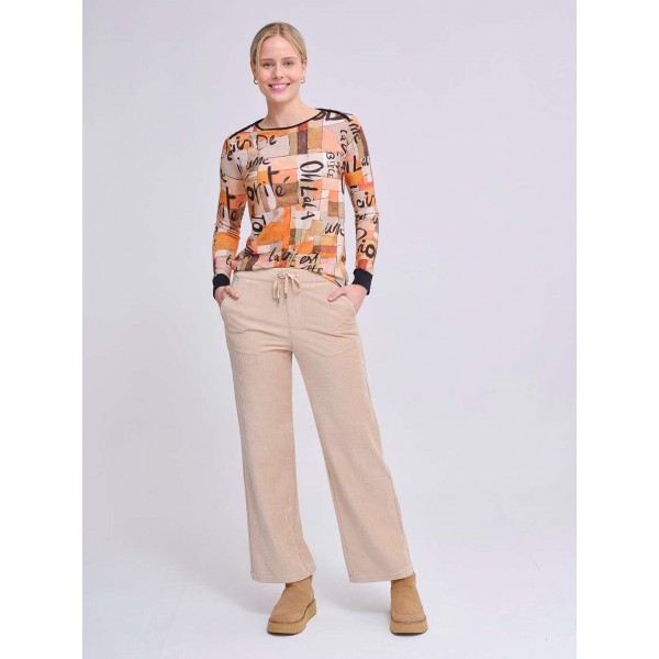 Camiseta manga larga con cuello caja, estampado geométrico cuadrados, triangulos, lestras Oh Lala en tonos naranja, rosa, tostados, verdes, blanco...