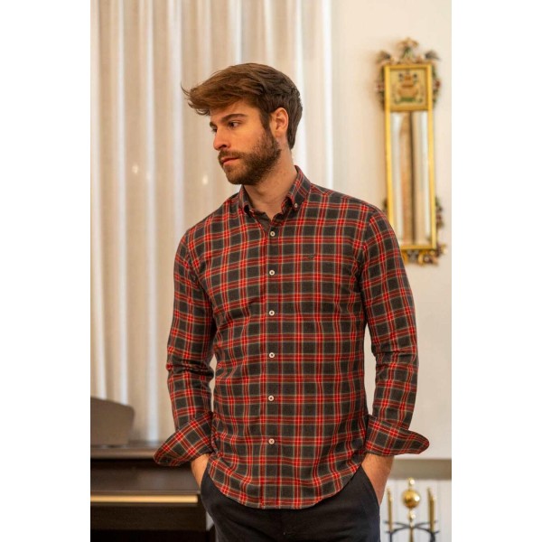 Camisa manga larga de cuadros, en color rojo, gris, celeste, blanco roto y amarillo, de la firma GILBERT TECKEL. LLeva combinado logo a contraste