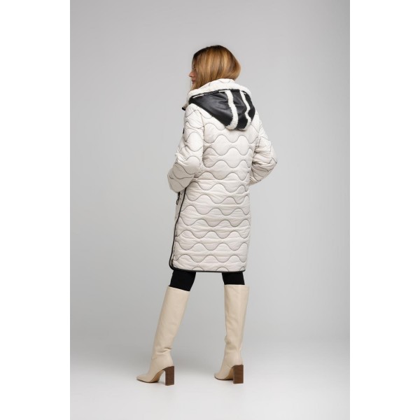 Parka diseño Alberta, Rever, acolchada con forro pelo interior, lisa, en tono blanco roto o negro, con ondas formadas por cosidos en x en tono...