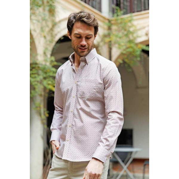 Camisa manga larga Carlos Cordoba, Modern fit, estampada en tonos verde, tostado y teja, sobre fondo beige o, en tonos teja y tostado, sobre...