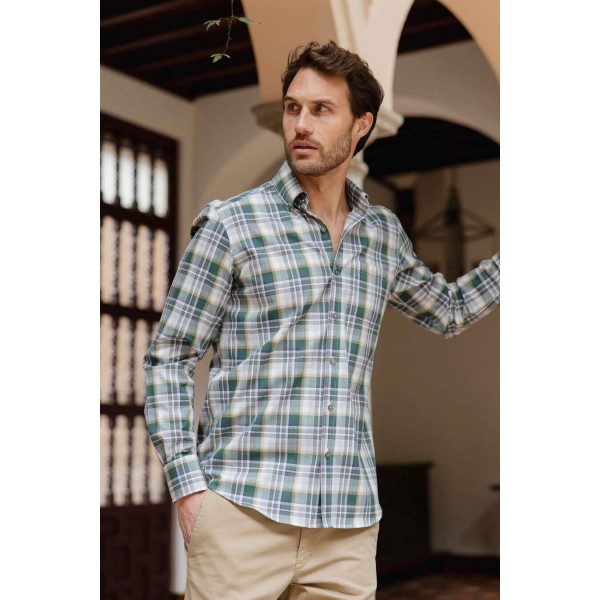 Camisa manga larga Carlos Cordoba, regular fit, cuadros en tonos verde kaki, negro, mostaza y arena. Lleva logo en bolsillo combinado a contraste.