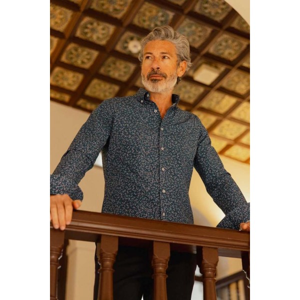 Camisa manga larga Carlos Cordoba, modern fit, estampado ramitas con flores en cereza, azul cobalto y blanco roto, sobre fondo azul marino.