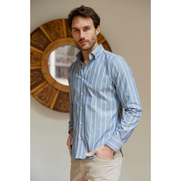 Camisa manga larga Carlos Cordoba, modern fit, rayas en tonos blanco roto y tostado, sobre fondo azul acero. Lleva logo, cosidos botones y ojales...