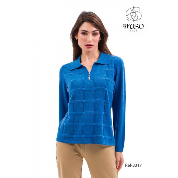Jersey juvenil, escote... 69,95 € Jersey jiuvenil escote pico con solapa y 4 botones decorativos en plata, de la firma Huso. Lana merino cuadros en tono azul a contraste