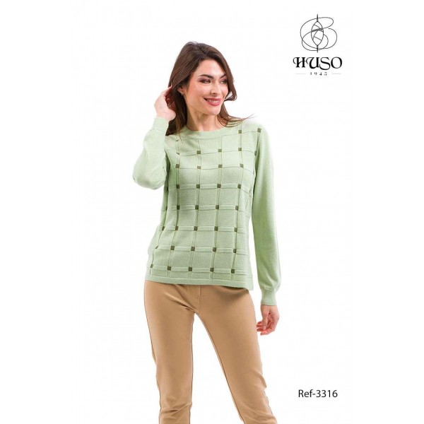 Jersey juvenil, cuello... 66,00 € Jersey jiuvenil cuello caja, de la firma Huso. Lana merino cuadros, en tono verde, con cuadros en verde kaki a contraste
