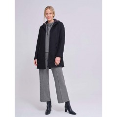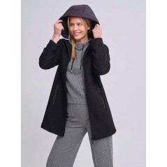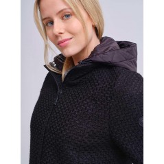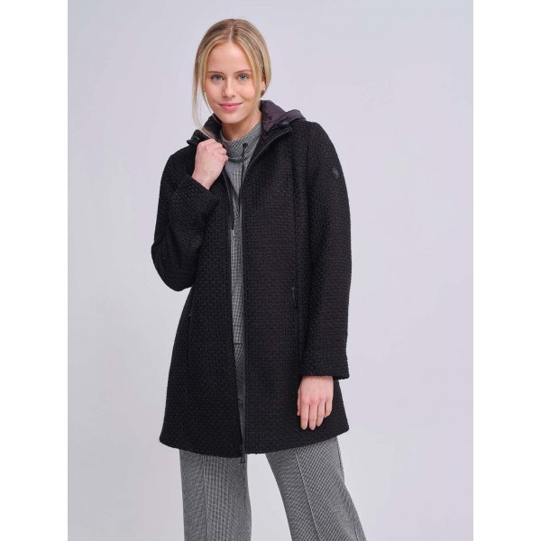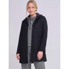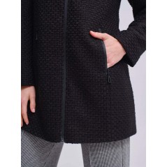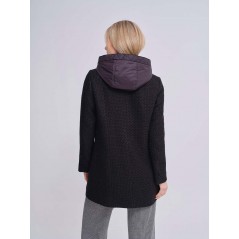 Abrigo juvenil simulando trenzado, en color negro, cierre por cremallera termosellada, de la firma Aza. Lleva 2 bolsillos laterales con cremalleras tremoselladas y capucha desmontable a contraste
