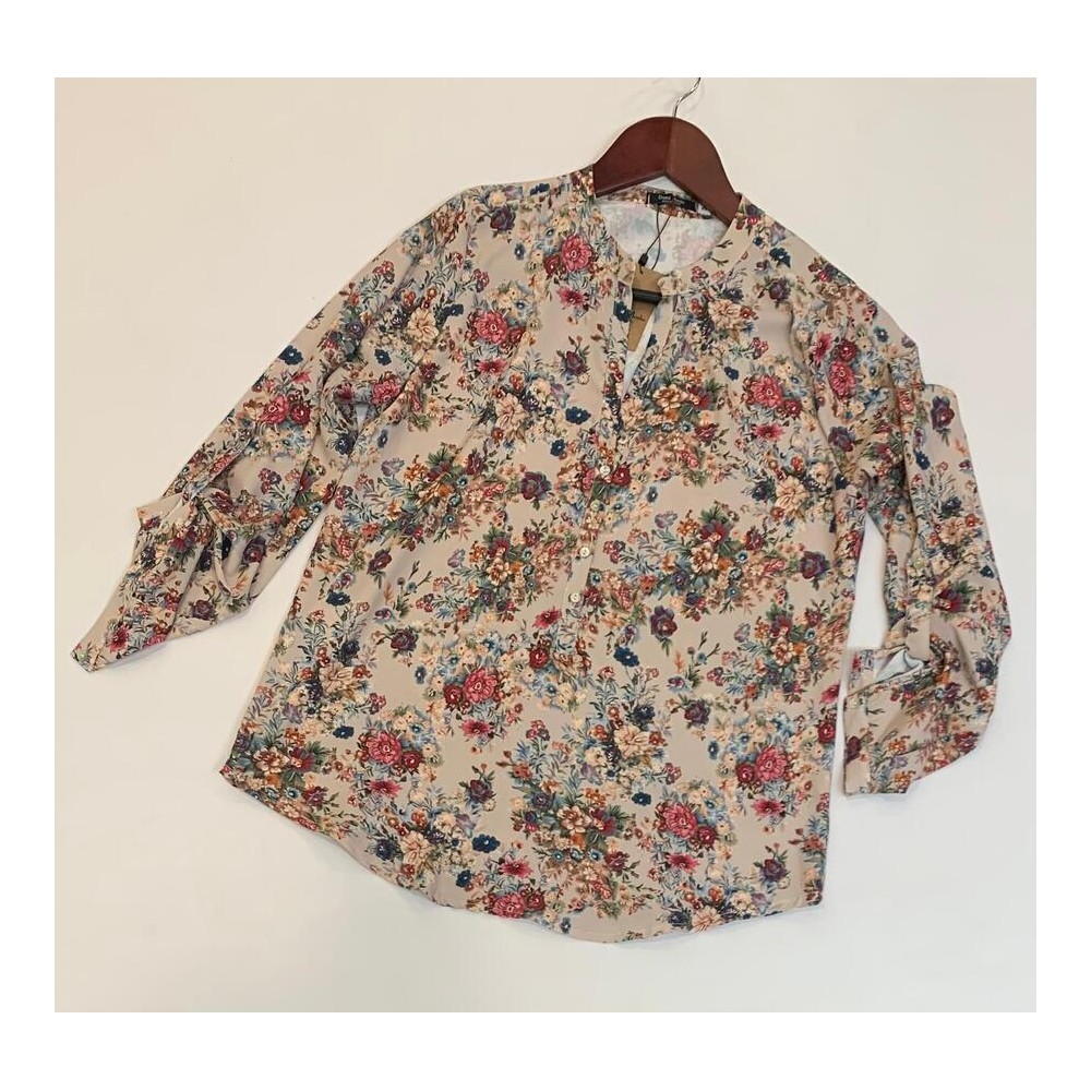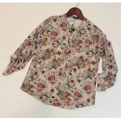 Blusa señora, escote pico con 4 botones, manga con recogedor de tira, estampado ramas/flores en tonos azules, rosa. granate, verde, mostaza y tostados; sobre fondo camel, de la firma Duos Moda.