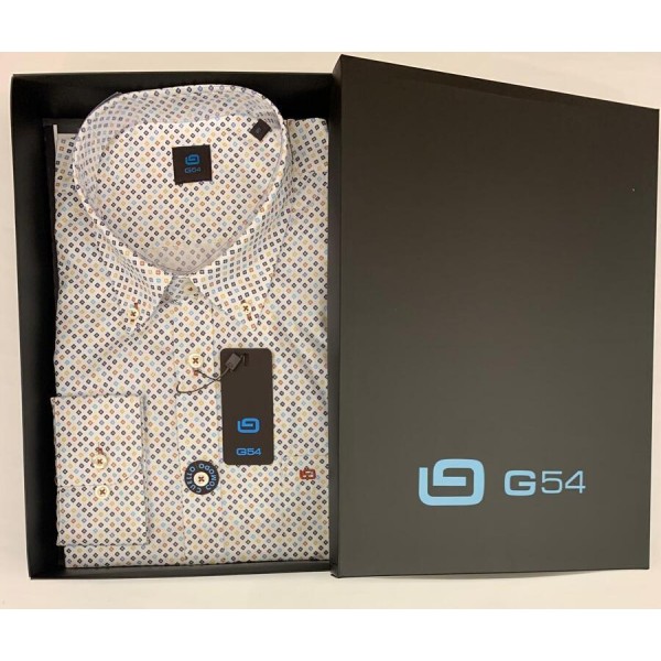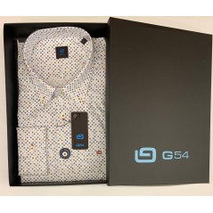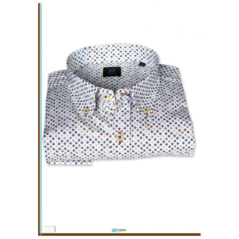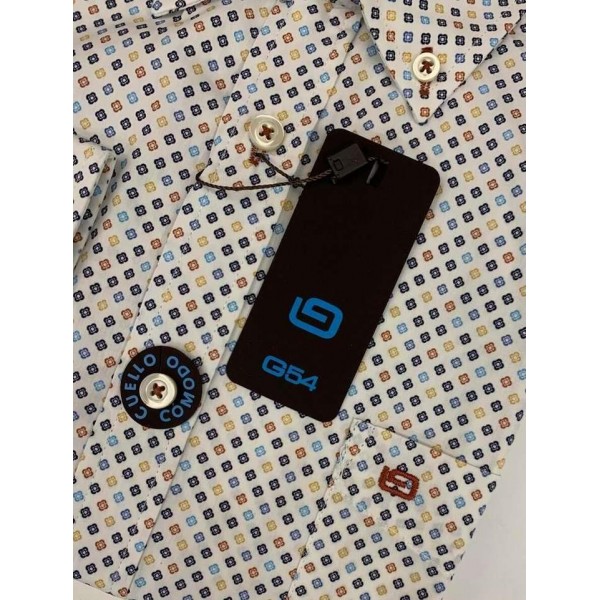Camisa manga larga salpicado con mini dibujo cuadrados en tonos teja/azul marino/ azul celeste y mostaza, sobre fondo blanco roto, de la firma G54. LLeva botones, cosidos botones/ojales y logo en bolsillo a contraste. Es cuello comodo. Con bolsillo