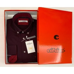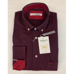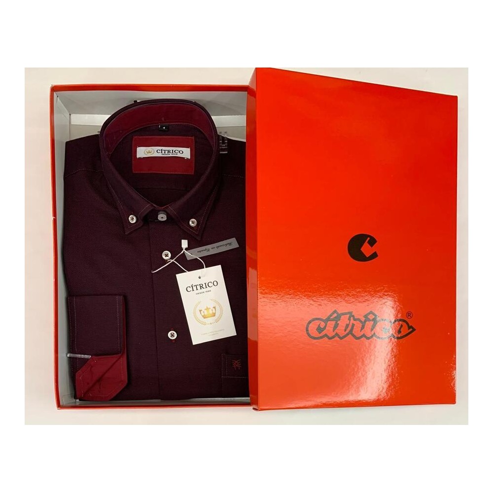 Camisa caballero, manga larga falso liso en tono granate o verde kaki , de la firma Citrico. Lleva interior cuello/puño, cosidos botones y logo combiando a contraste en vino o verde botella, respectivamente