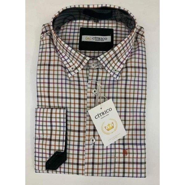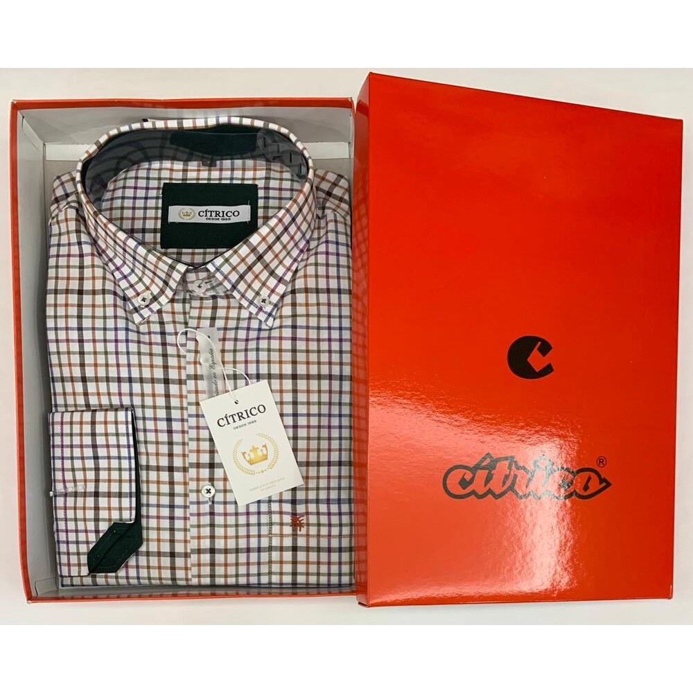 Camisa caballero, manga larga lineas formando cuadros en tono azul, teja, verde kaki, malva y marrón, sobre fondo blanco roto , de la firma Citrico. Lleva interior cuello/puño, cosidos botones combiando a contraste en Verde botella. Logo en tono rojo