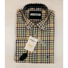 Camisa caballero, manga larga lineas formando cuadros en tono azul marino, mostaza, verde kaki, granate y blanco roto , de la firma Citrico. Lleva interior cuello/puño, cosidos botones y logo combiando a contraste en Verde botella.