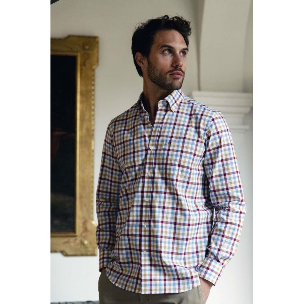 Camisa manga larga Carlos Cordoba, regular fit, cuadros en tonos granate, azul celeste, blanco roto y arena. Lleva logo en bolsillo combinado a contraste.