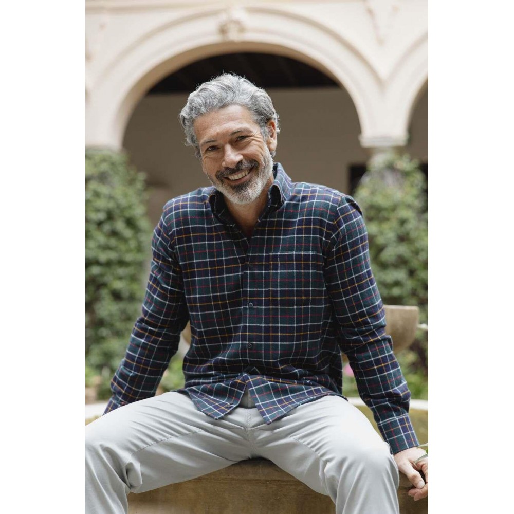 Camisa manga larga viella de Carlos Cordoba, regular fit, cuadros en tonos verde botella, azul marino, rojo, msotaza y blanco roto. Lleva logo combinados a tono.