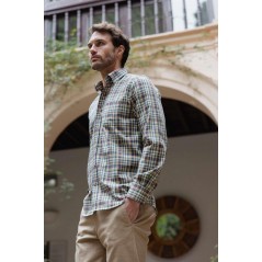 Camisa manga larga de Carlos Cordoba, regular fit, cuadros en tonos verde botella, azul marino, granate, msotaza y blanco roto. Lleva logo en bolsillo combinado a contraste