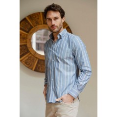 Camisa manga larga Carlos Cordoba, modern fit, rayas en tonos blanco roto y tostado, sobre fondo azul acero. Lleva logo, cosidos botones y ojales combinados a contraste