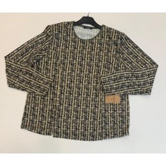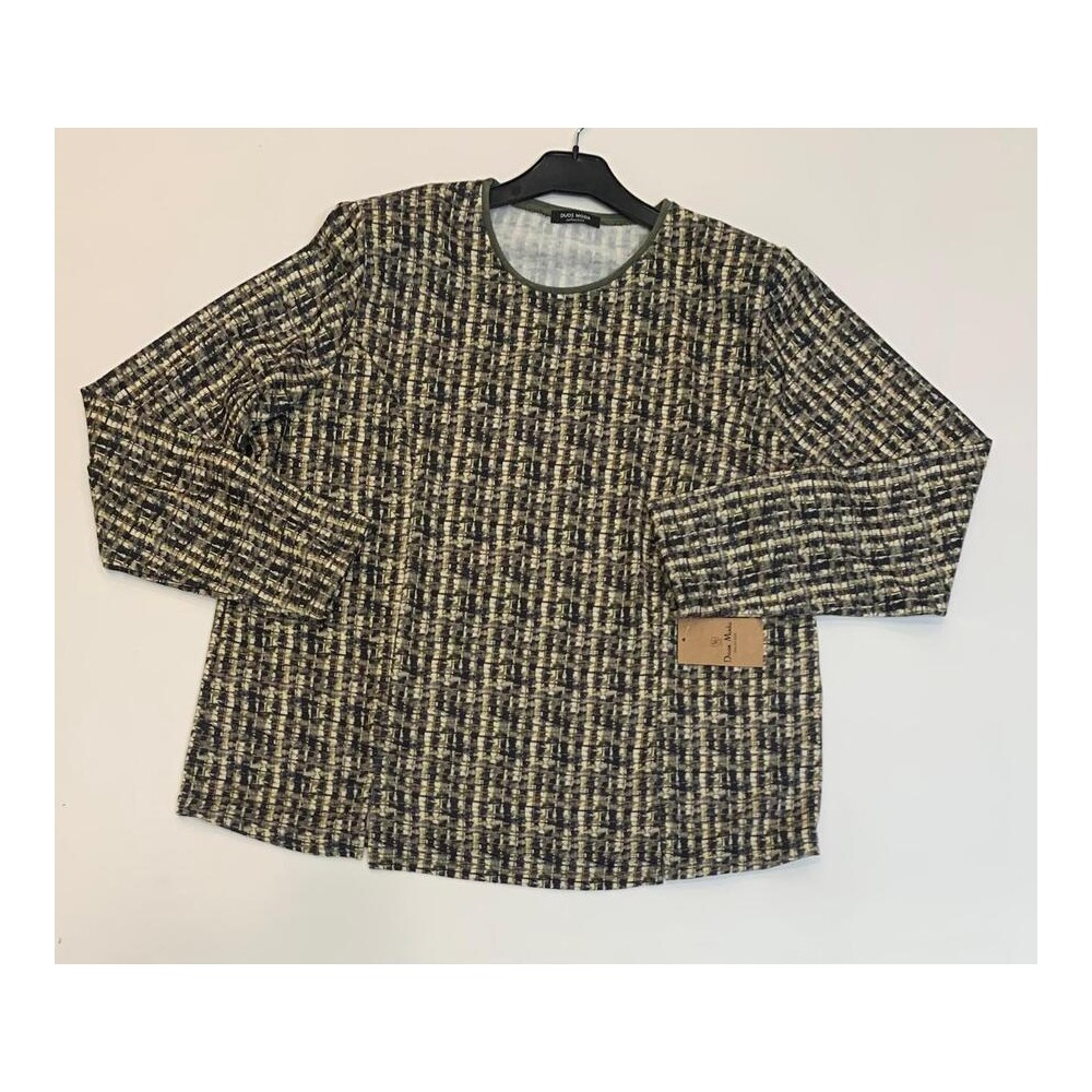 Camiseta manga larga, cuello caja, estampado smulando trenzado en tono verde kaki, beige, mostaza y negro, de la firma Duos Moda. Lleva vivo cuello en verde kaki liso y dos aberturas laterales