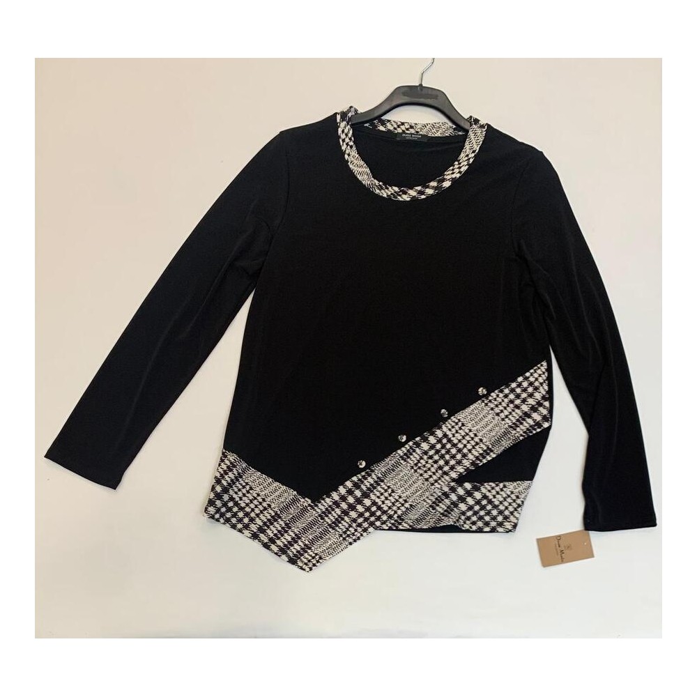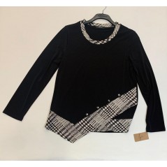 Camiseta manga larga, cuello caja lisa simulando abertura/lazada estampada en cintura combianda con cuello y botones decorativos, en color negro combinado con blanco roto, de la firma Duos Moda