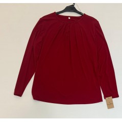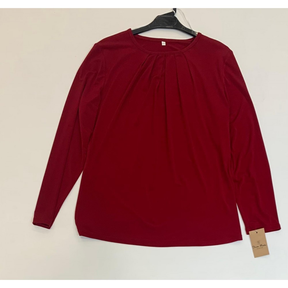 Camiseta manga larga, cuello caja, lisa con pliegues desde cuello, en color granate, de la firma Duos Moda