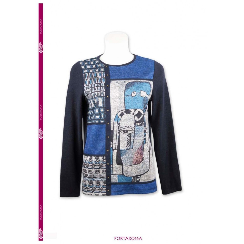 Camiseta mujer juvenil, manga larga, cuello redondo, de la firma Portarossa, estampado astrasto caras, en tonos azul marino, gris perla y azulón, por delante y, mangas y por detras, en marino liso. Lleva tachuelas decorativas en cenefa vertical por delante