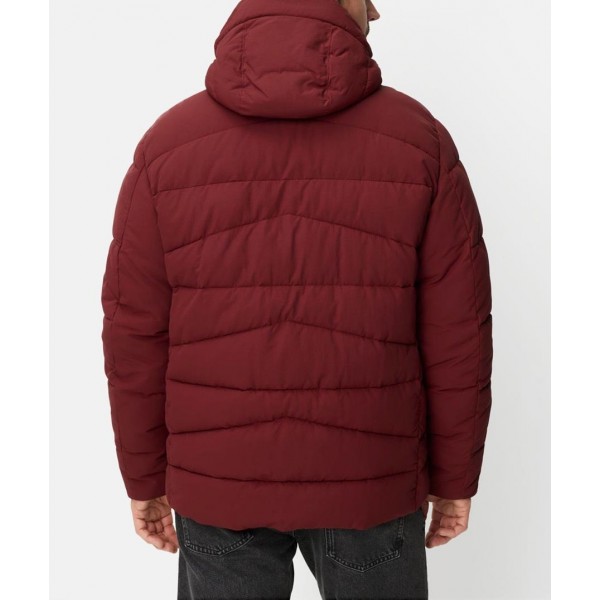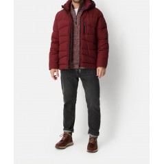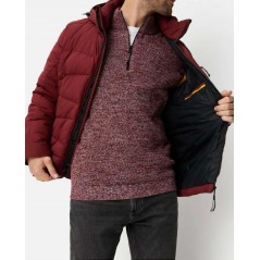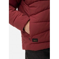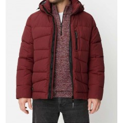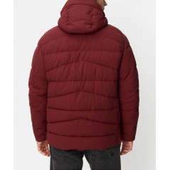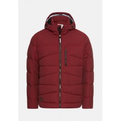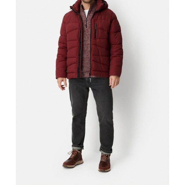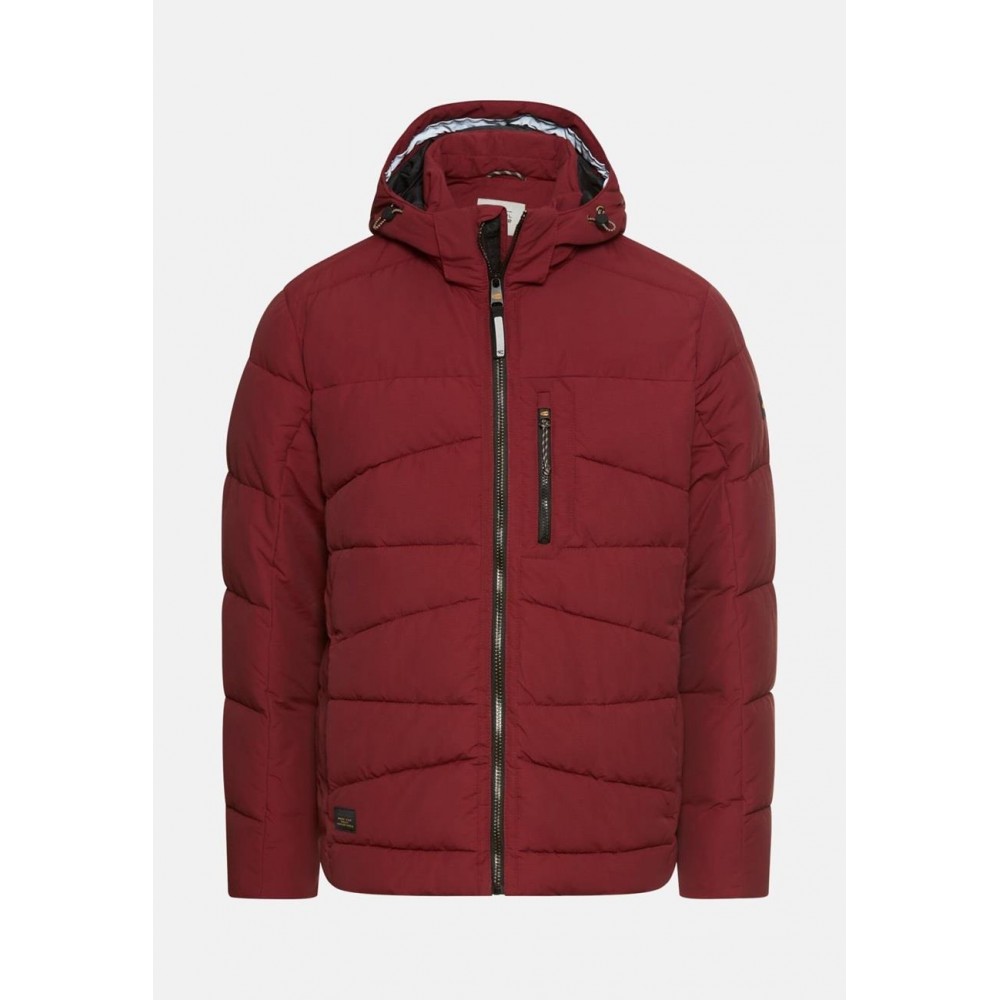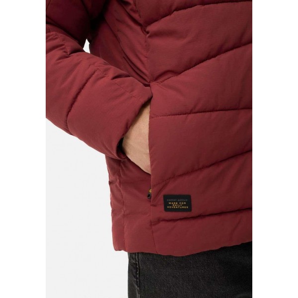 Cazadora acolchada, con capucha desmostable, en color granate, de Camel Active, con logo de Camel Active en manga, cintura y espalda-cuello. Tiene dos bolsillos laterales forrados con cremallera oculta y otro bolsillo en pecho, con cierre por cremallera. Lleva tapeta cremallera con logo grabado. Con reflectante en capucha. Cierre por cremallera bicolor negra/detalle_mostaza