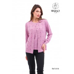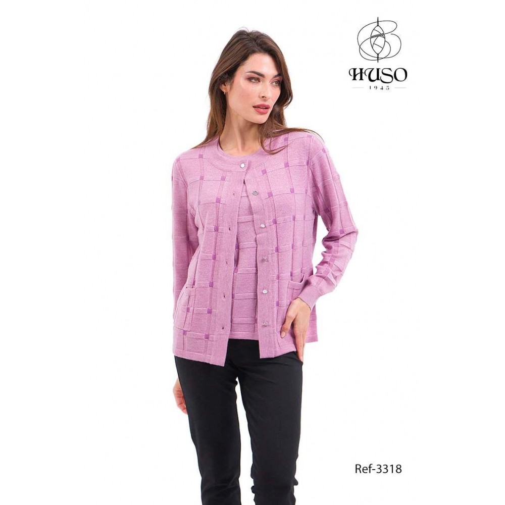 Chaqueta punto jiuvenil botoenes, cuello caja, de la firma Huso. Lana merino cuadros, en tono malva, con cuadros en malva fuerte a contraste. Llleva bonito botón a contraste en plata