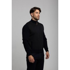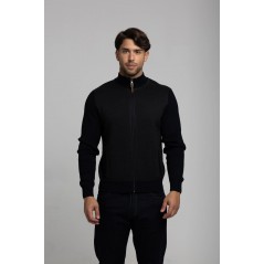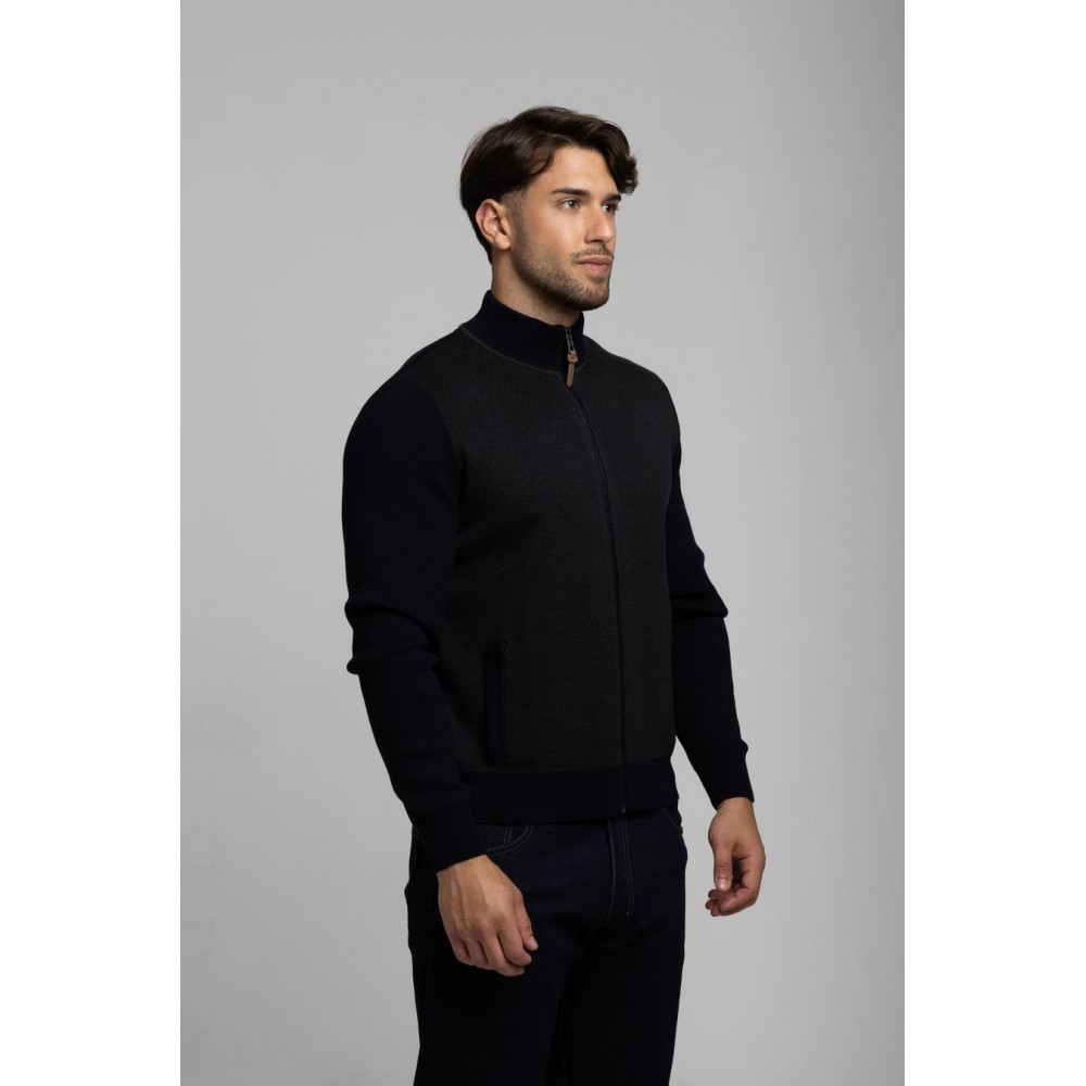 Chaqueta cuello semicisne cremallera, diseño Mateo, de la firma Rever. Falso liso en parte delantera espiga en tonos azul marino/gris o azul marino/verde. Mangas, espalda, cuello/cintura en azul marino liso e interior cuello en gris o azul marino/verde, respectivamente según color