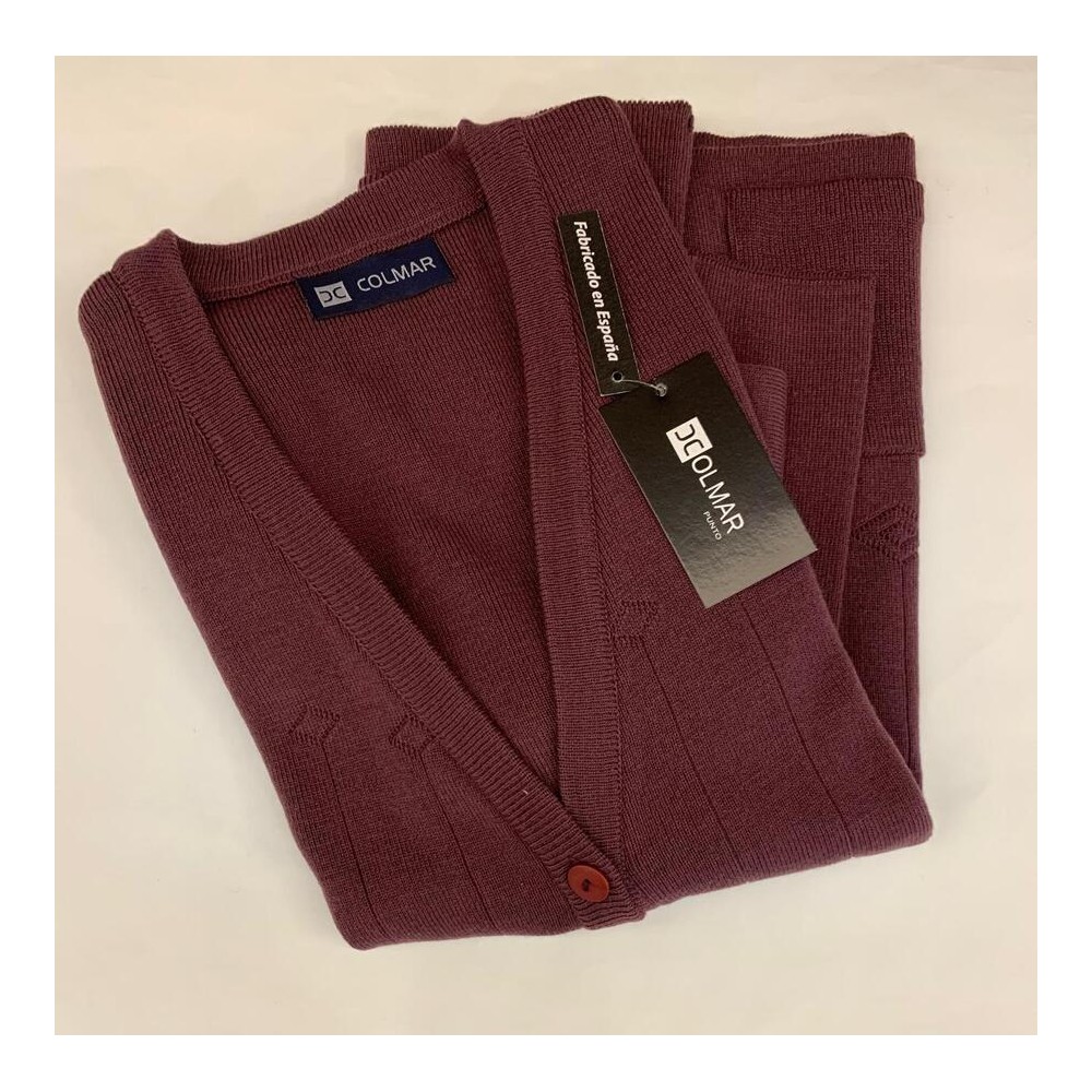 Chaqueta punto señora, lisa punto goma, escote pico, de la firma Colmar. Lleva cierre por botones y dos bolsillos laterales.