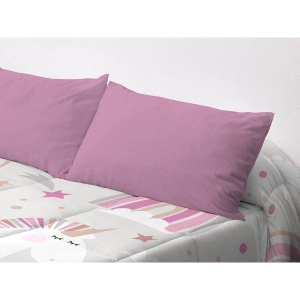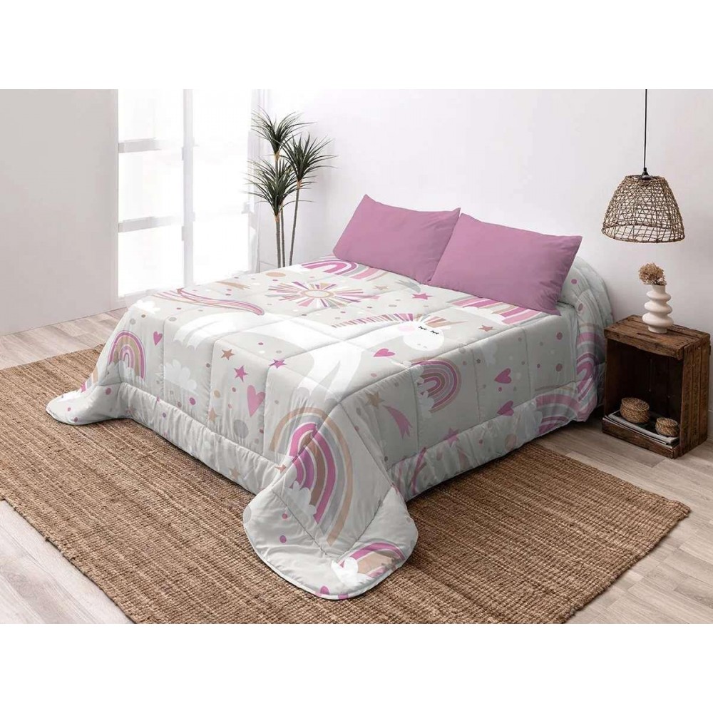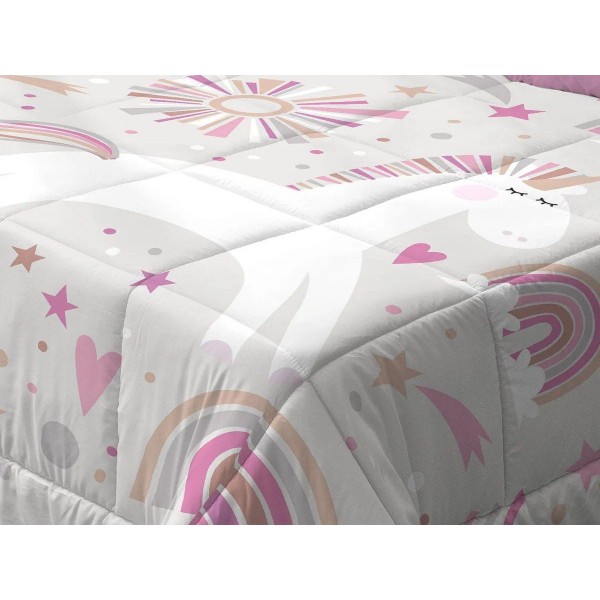 Edredón confort digital infantil de Karamelo, modelo Fantasy, impresión digital de unicornio/arcoiris/nubes/ estrellas en tonos gris, blanco roto, malva, lila y arena. Edición limitada