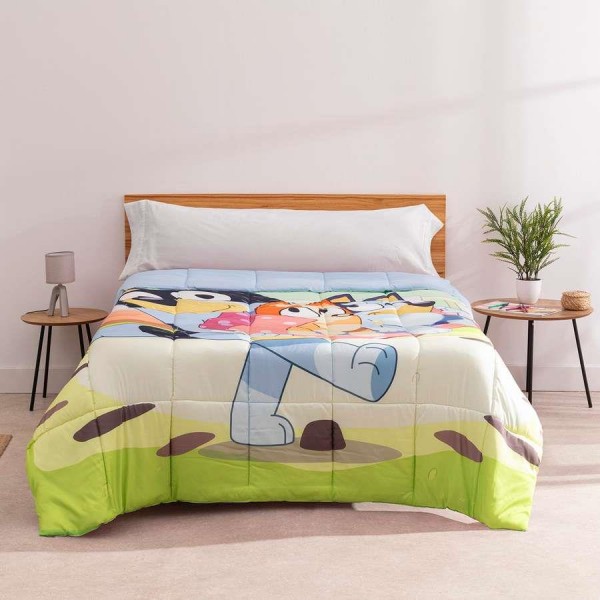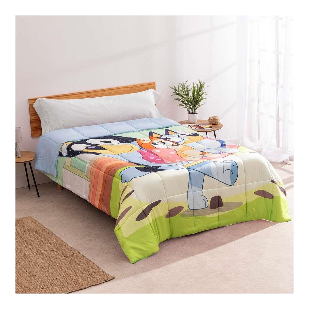 Edredón confort infantil, modelo Bluey. Dibujos de Bluey paisaje combinado en colores azules, rosa, amarillo, verde, blanco roto y teja