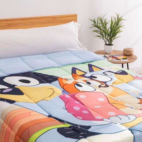 Edredón confort infantil, modelo Bluey. Dibujos de Bluey paisaje combinado en colores azules, rosa y teja