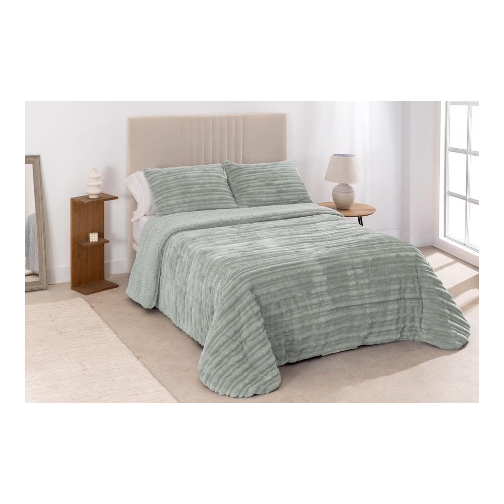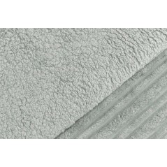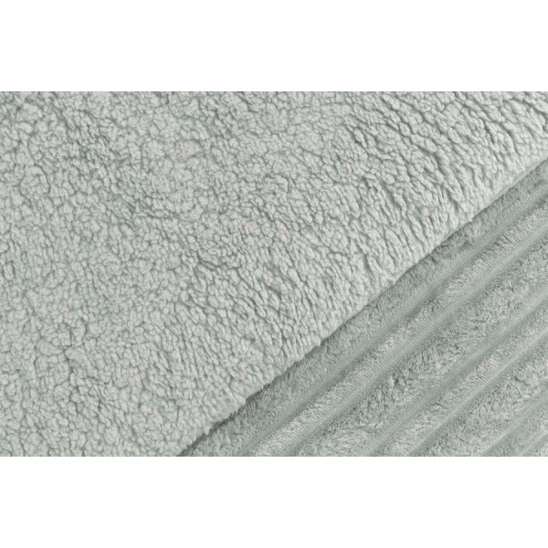 Edredón Jacquard modelo Kieva, Sharpei, de Karamelo. Con interior de borreguillo, muy suave y caliente, ideal para los meses de invierno. Relieve rayas horizontales en tono agua marina, blanco o gris. Por la parte interior, sherpa a tono según color.