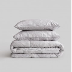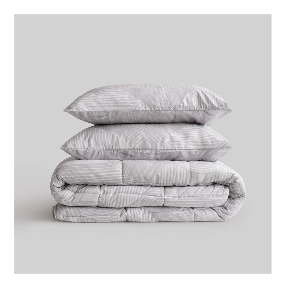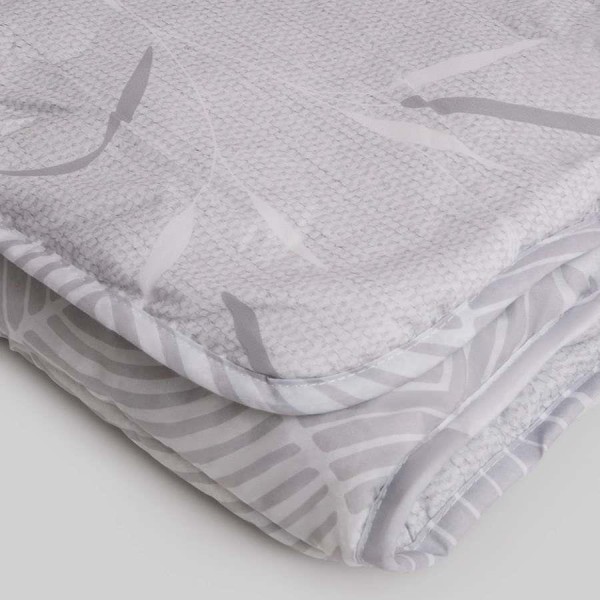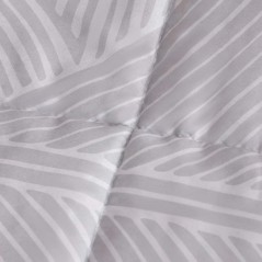 Edredón confort digital de Don Algodón, modelo Cosima, impresión digital reversible de rayas formando hojas en tonos grises sobre fondo gris, por un lado. Por el otro lado, dibujo ramas con hojas sobre fondo degradado en tonos grises