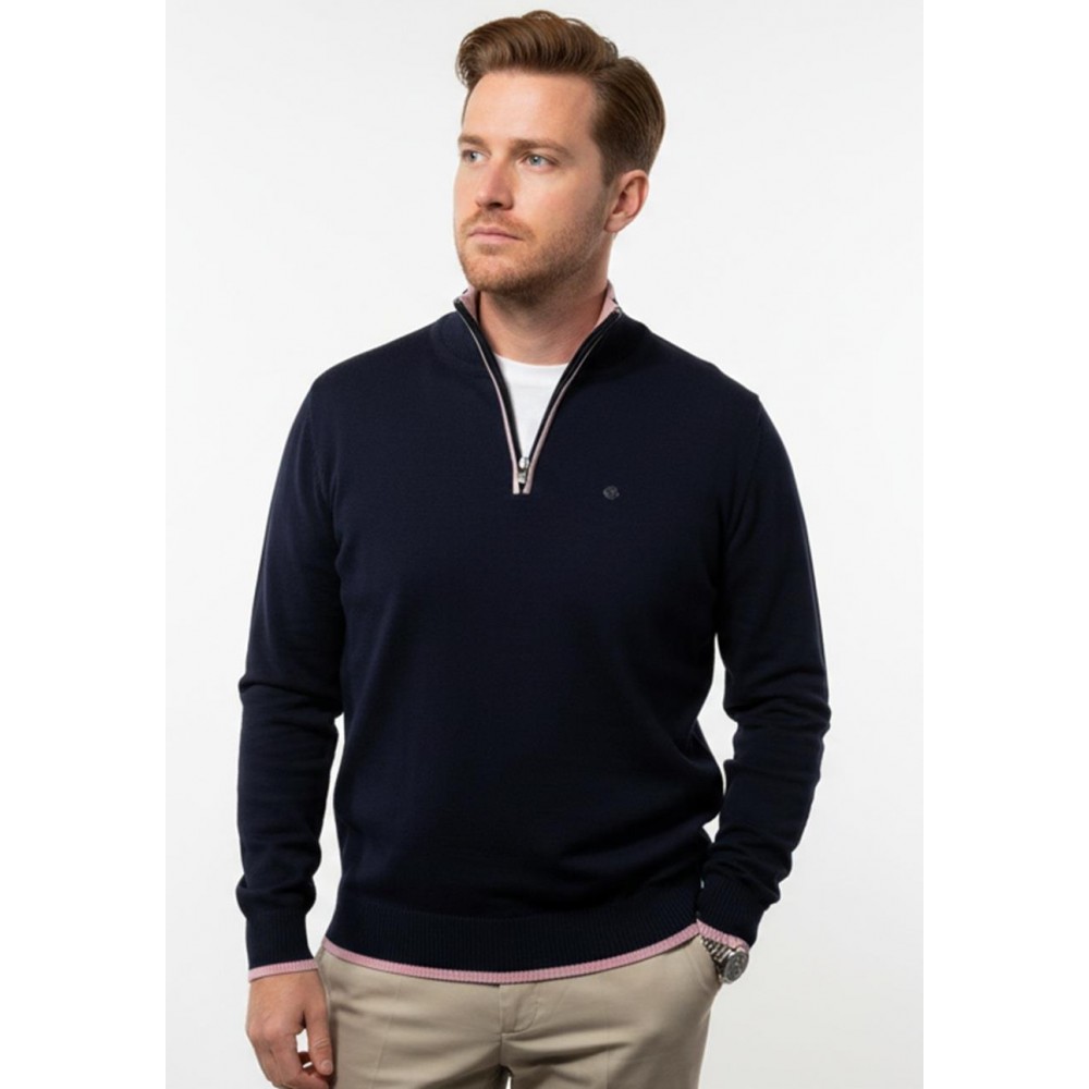 Jersey juvenil cuello semi cisne cremallera, modelo Pine, de la firma CLK Polo, en azul marino o verde botella. Lleva interior cuello, vivos puño/cintura y vivos cremallera combinados a contraste en rosa palo/blanco o azul marino/blanco, respectivamente. Lleva logo en placa metal cosida