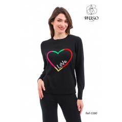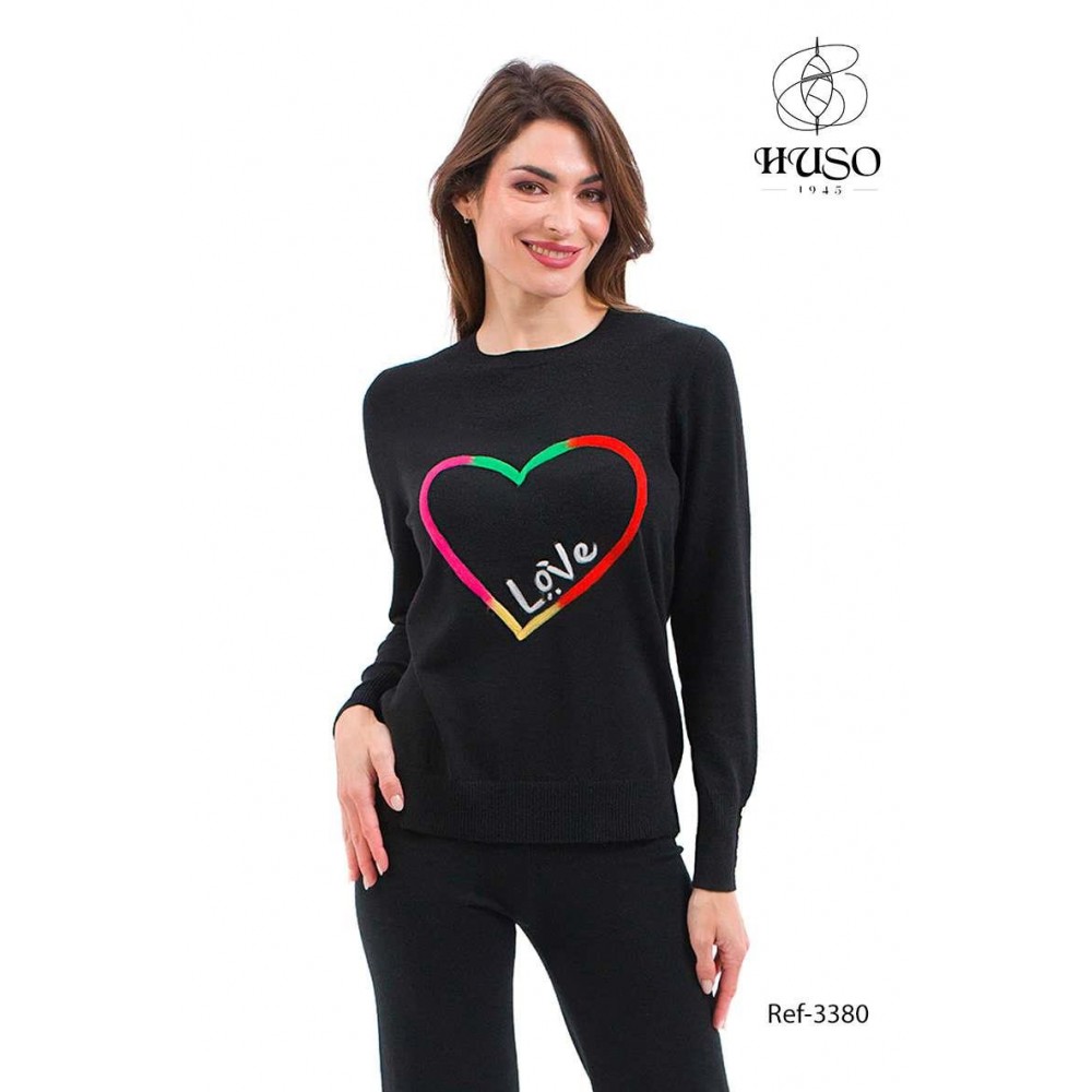Jersey jiuvenil, cuello redondo, corazón arcoiris love, de la firma Huso, en color negro con corazón arcoiris en tonos rojo, verde, rosa y amarillo , combinado a contraste con love en blanco roto.