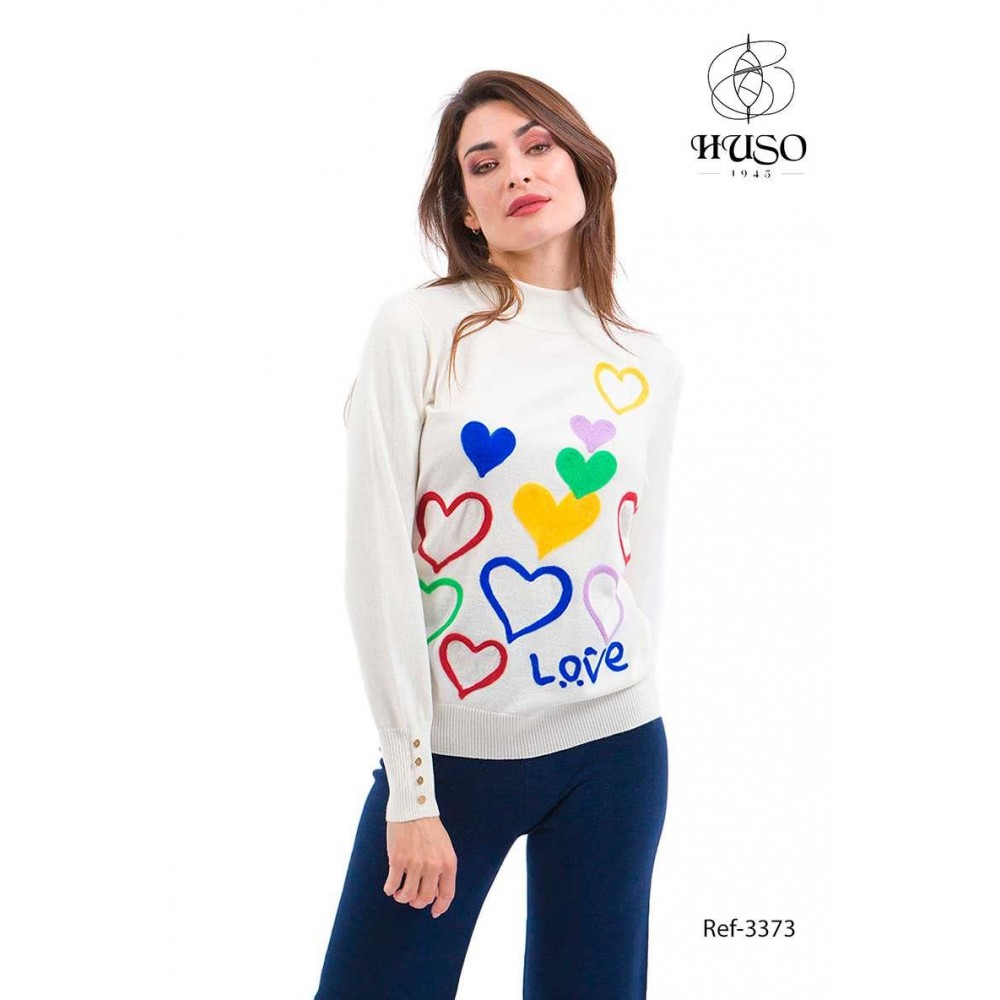 Jersey jiuvenil, cuello semi cisne, corazones colores, de la firma Huso, en color blanco roto con corazones en tonos rojo, verde, azul, lila y amarillo , combinado a contraste con love en azul.