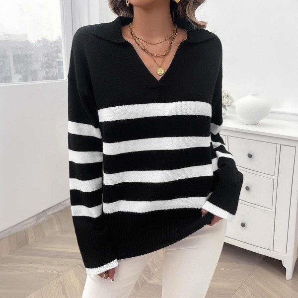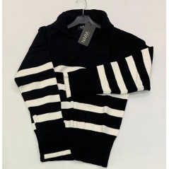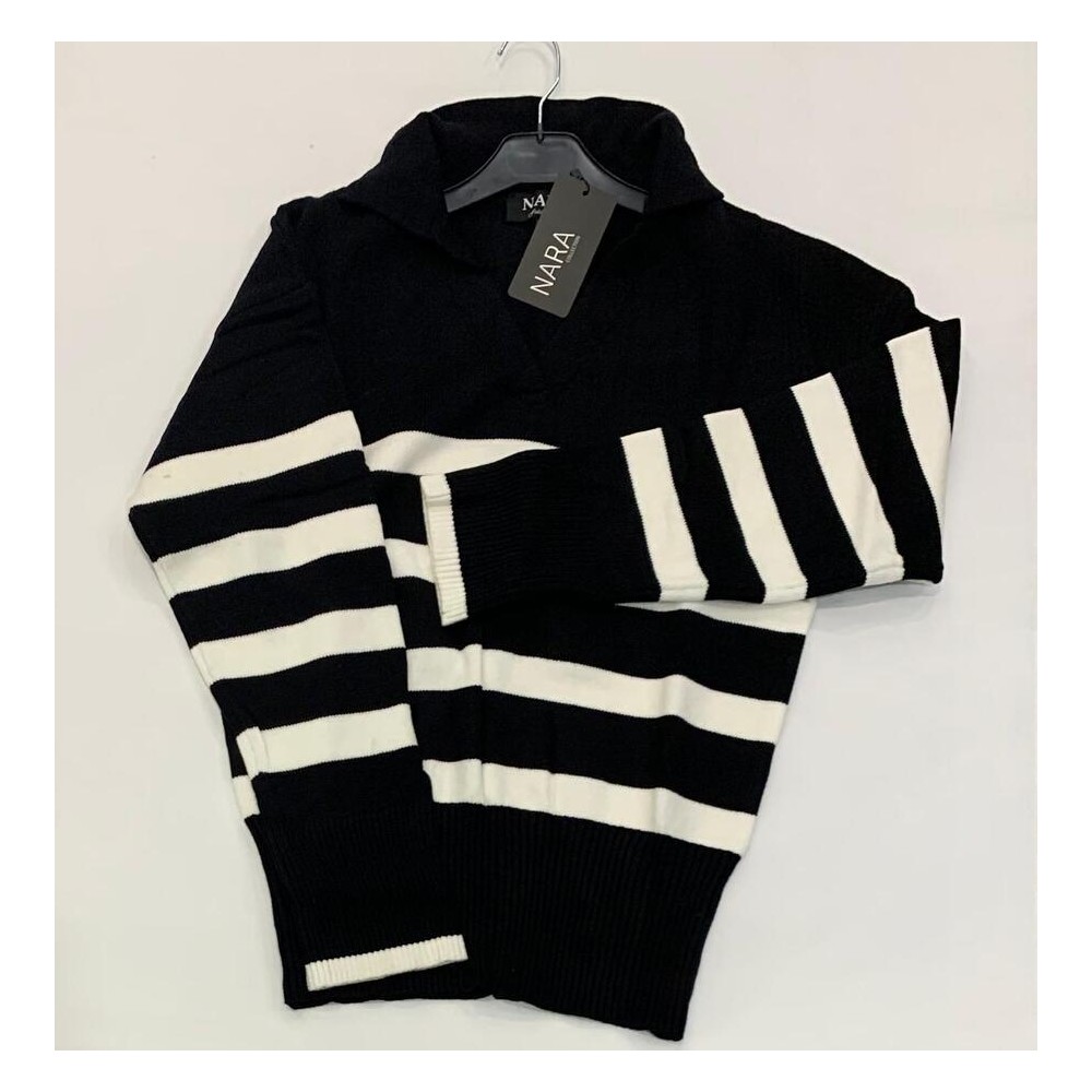 Jersey cuello pico con solapa de rayas en color negro y blanco roto, de la firma Nara