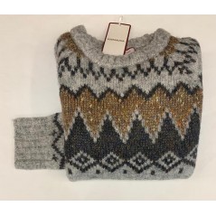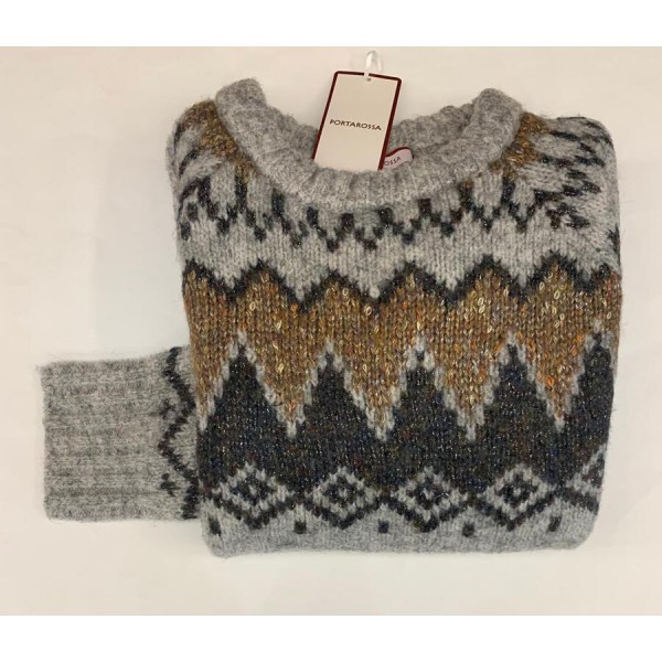 Jersey mujer juvenil, manga larga, cuello redondo, de la firma Portarossa, estampado azteca en tonos azul y tostado, sobre fondo gris perla. Lleva cenefa haciendo zig-zag en mangas y cintura a contraste