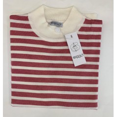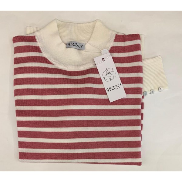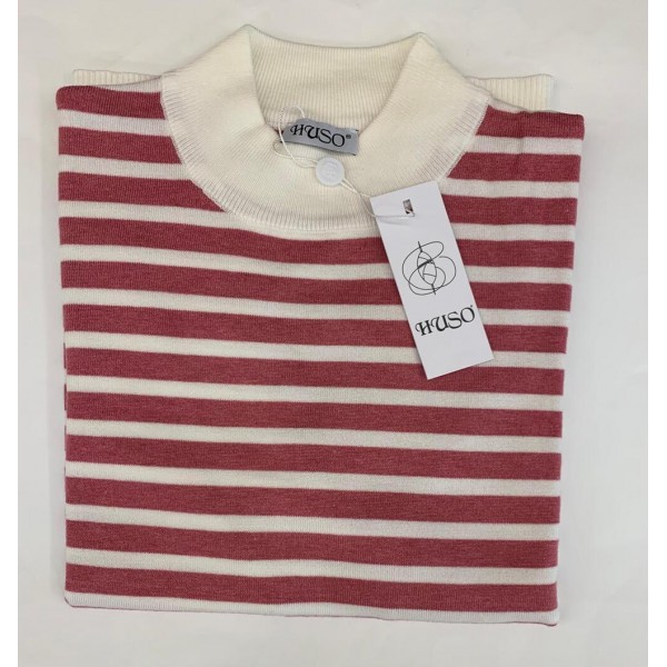 Jersey jiuvenil, cuello semi cisne, de la firma Huso, con rayas combinadas a contraste en cereza/blanco. Lleva cuello/puño en blanco liso y botones decorativos puño en tono plata