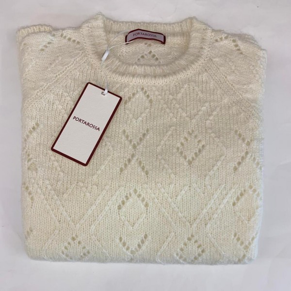 Jersey mujer juvenil, manga larga, cuello caja, de la firma Portarossa, relive/calados x/rombos e tono blanco roto