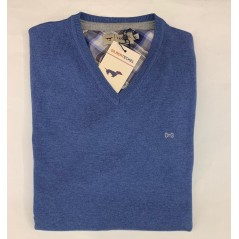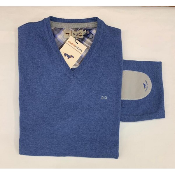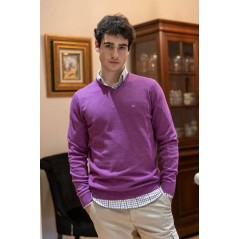 Jersey cuello pico de la firma Gilbert Teckel, en malva o azul acero, con logo combinado a contraste en gris