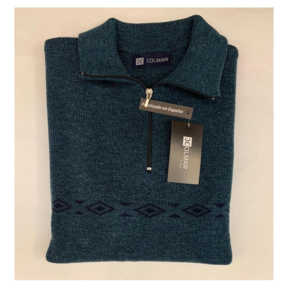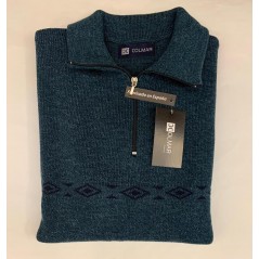 Jersey punto caballero, cremmallera cuello, liso lana con cenefa yakar en pecho, en color esmeralda vigoré, de la firma Colmar.
