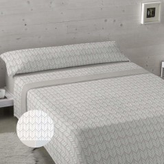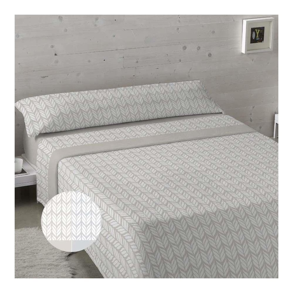 Juego sábanas coralina de Karamelo Premium, diseño Veda. Perchado dos caras, dibujo espiga en blanco roto, sobre fondo beige o gris, combinados con bajera lisa y embozo, según color en beige o gris, respectivamente