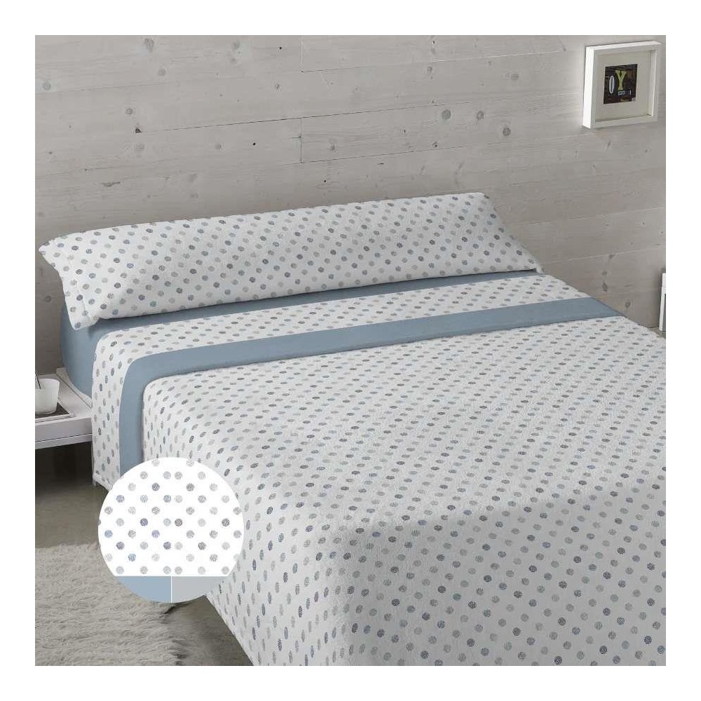 Juego sábanas coralina de Karamelo Premium, diseño Idelia. Perchado dos caras, dibujo topos colores azules y grises, sobre fondo blanco roto, combinados con bajera lisa y embozo, según color en azul o gris, respectivamente