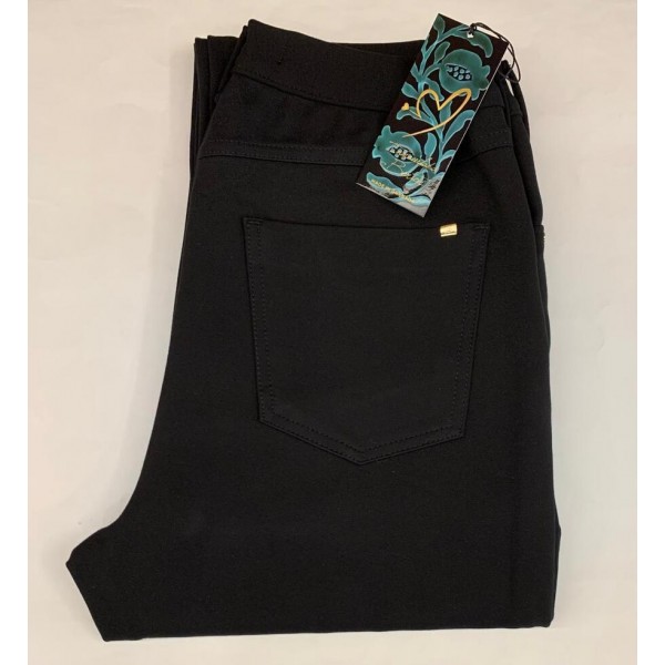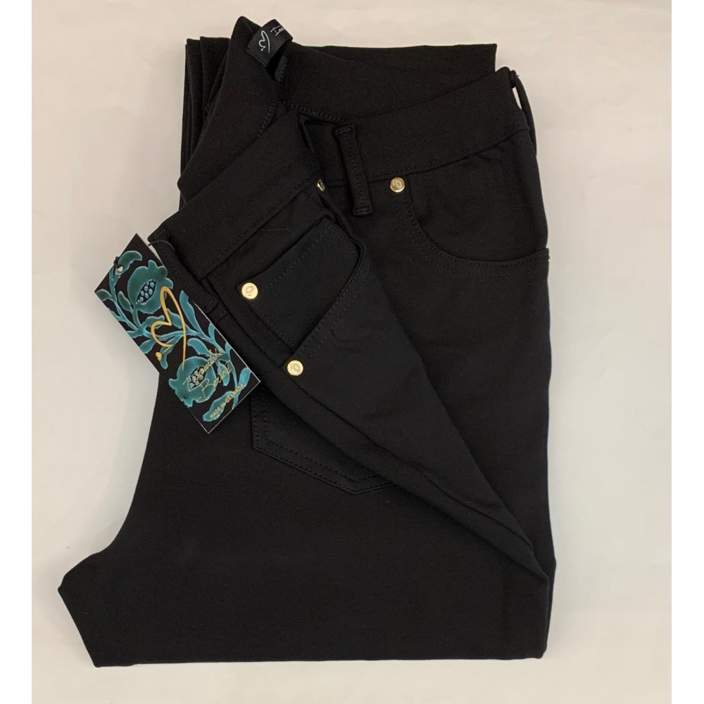 Pantalón 5 bolsillos, de la firma Inmaculada Bertos. Lleva cosido a tono, logo en chapa bolsillo trasero combinado con remaches bolsillos delanteros. Disponible en verde boella y negro