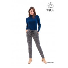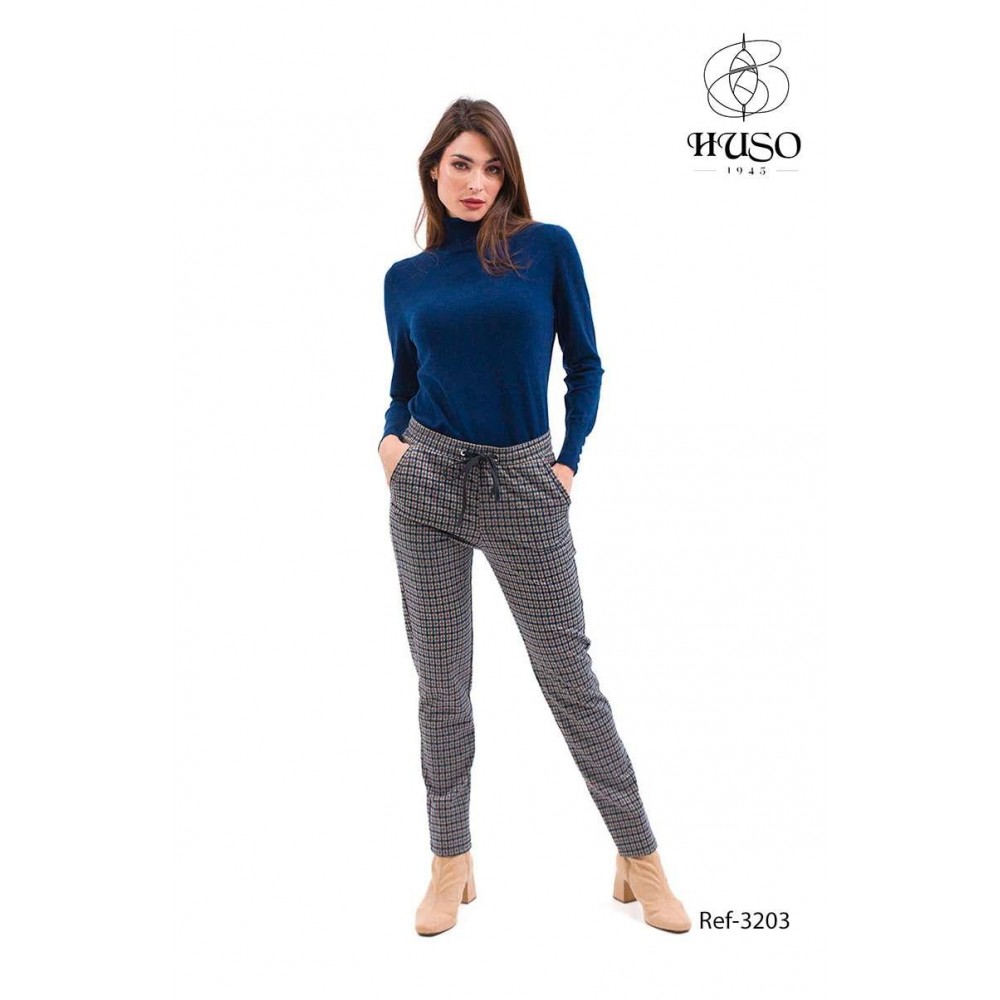Pantalón señora modelo Jacquard, de la firma Huso, cuadros en tonos Camel y negro. Lleva cintura elástica con ajuste por cordones a contraste, 2 bolsillos laterales tipo chino y 2 bolsillos traseros. Sin cremallera