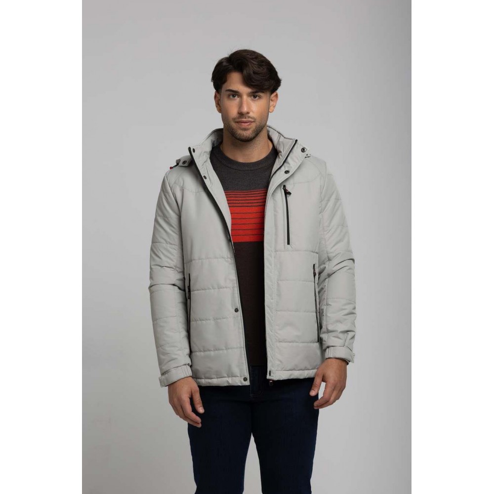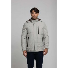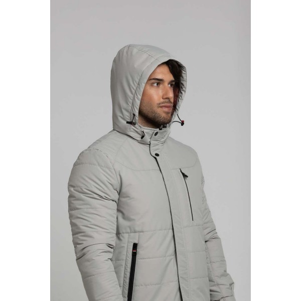 Parka caballero forrada, diseño Lenon de Rever, color Azul marino, beige o verde oscuro, cierre por cremallera y tapeta con corchetes, capucha desmontable, bolsillos laterales y pecho con cremallera. Los bolsillos tienen combinado a contraste cremallera y tirador. Lleva 2 bolsillos interiores con cremallera. Lleva interior capucha combinado a contraste tipo nido de abeja en teja/negro