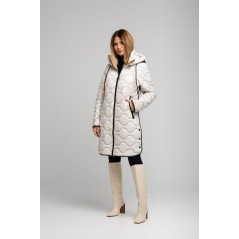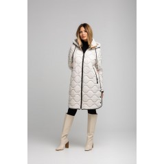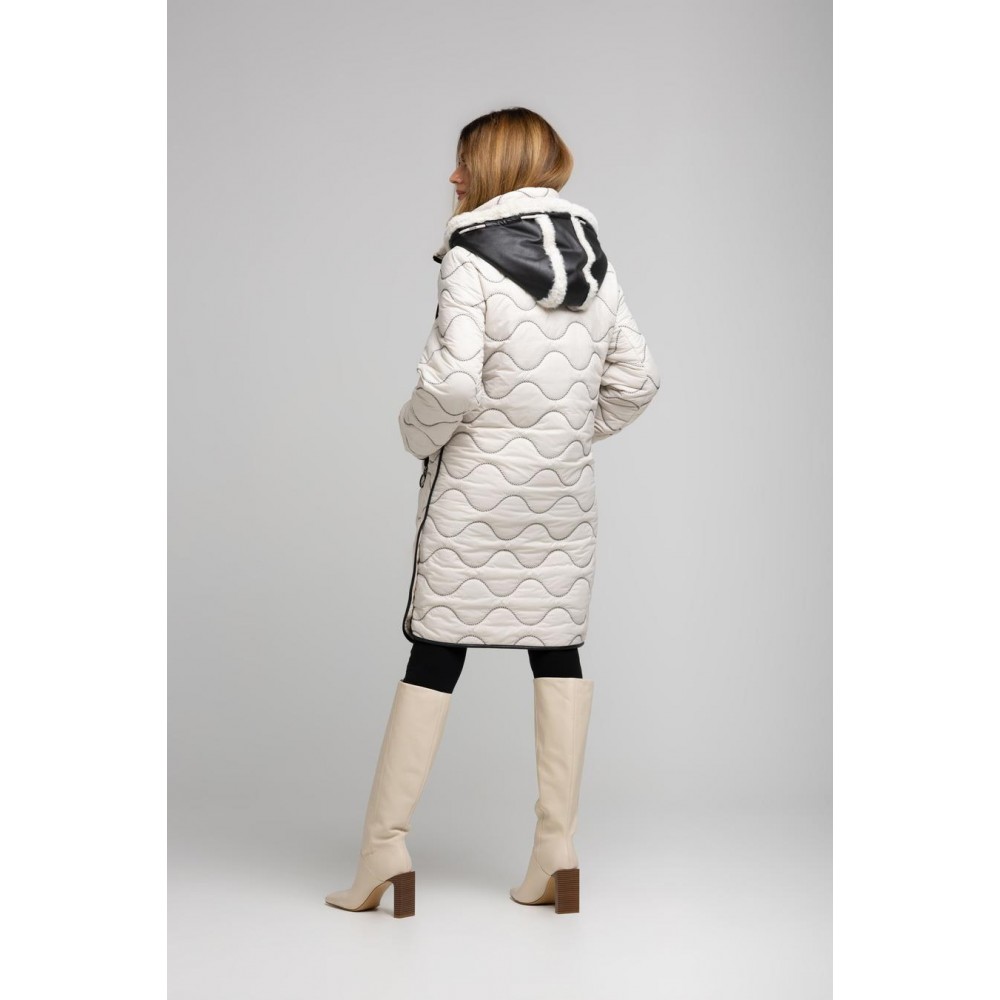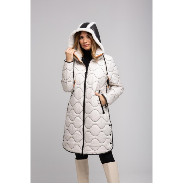 Parka diseño Alberta, Rever, acolchada con forro pelo interior, lisa, en tono blanco roto o negro, con ondas formadas por cosidos en x en tono negro o blanco roto, respectivamente. Lleva aberturas laterales con corchetes. Bolsillos laterales con cierre por cremallera. Llleva capucha desmontable en negro/pelo blanco con tiradores en negro/blanco. Cremalleras a contraste con vivos en negro