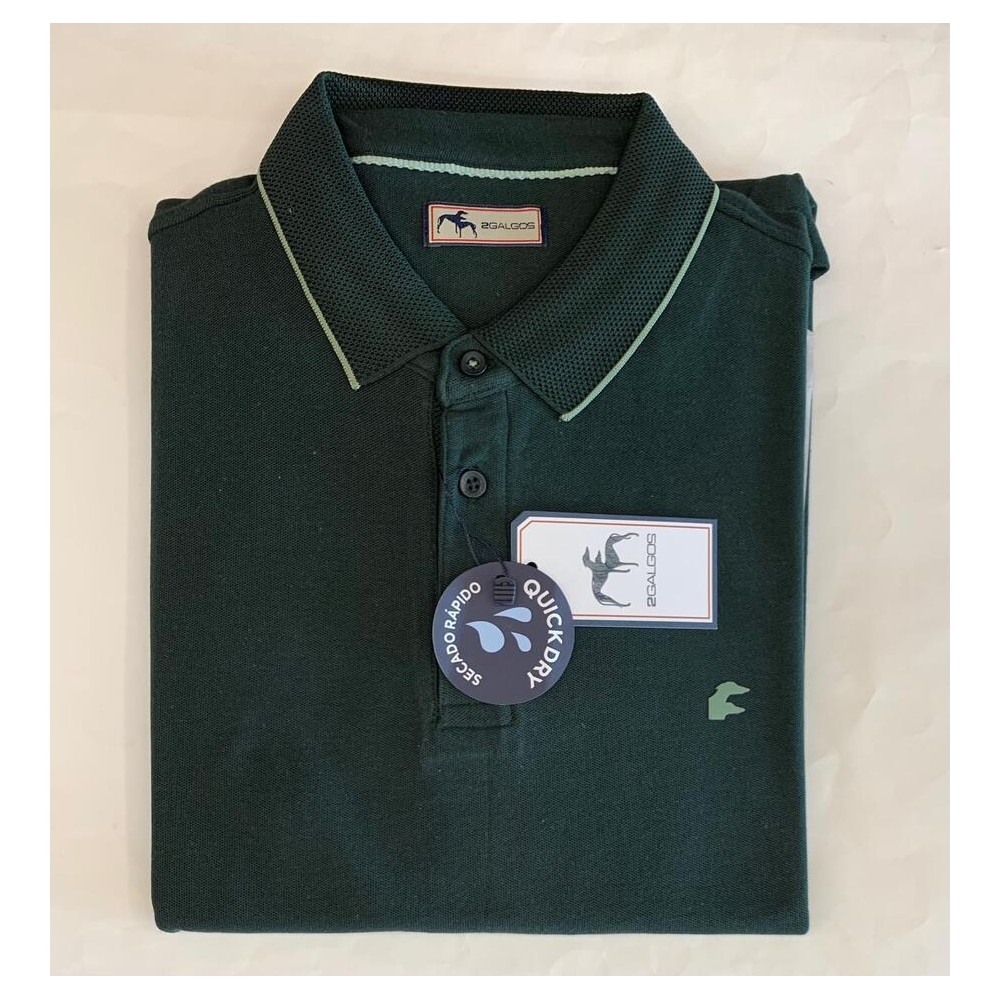 Polo manga larga liso en tono verde botella, de la firma Dos Galgos. Lleva cuello en falso liso tipo colemena con vivo en verde claro, combiando con logo y cosidos aberturas laterales. Sin bolsillo. Secado rapido. Quick Dry