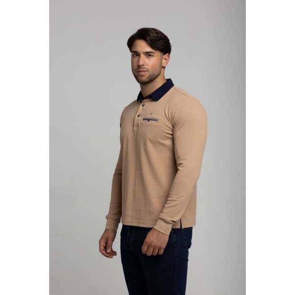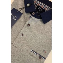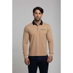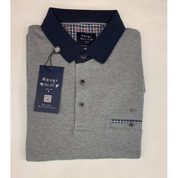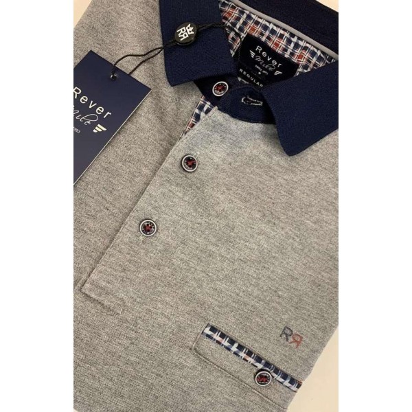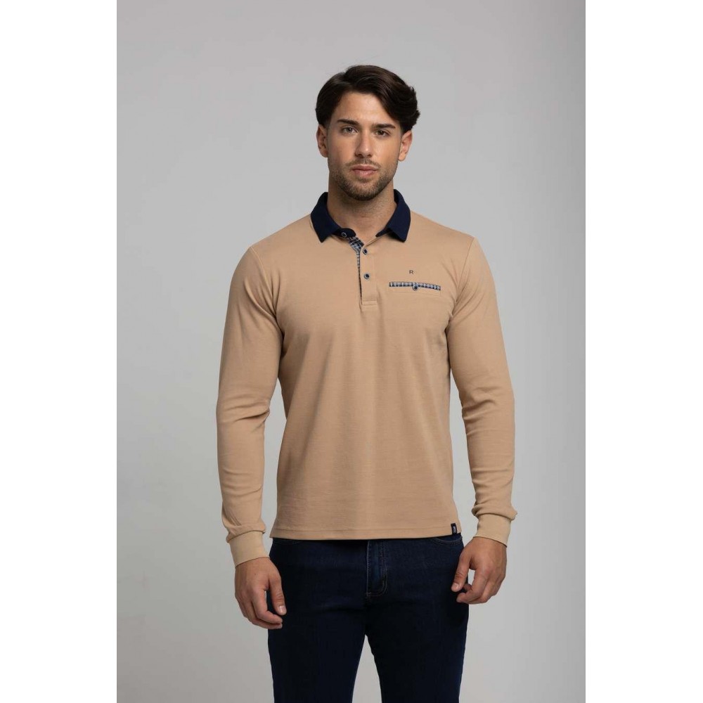 Polo manga larga, liso en tono gris claro o arena, diseño Lago, de la firma Rever. Lleva combinado a contraste cuello/vivo bolsillo oculto/ tapeta/ logo/ botones/ cosidos botones en marino/rojo. Logo RR en marino/rojo. Lleva bolsillo oculto con botón